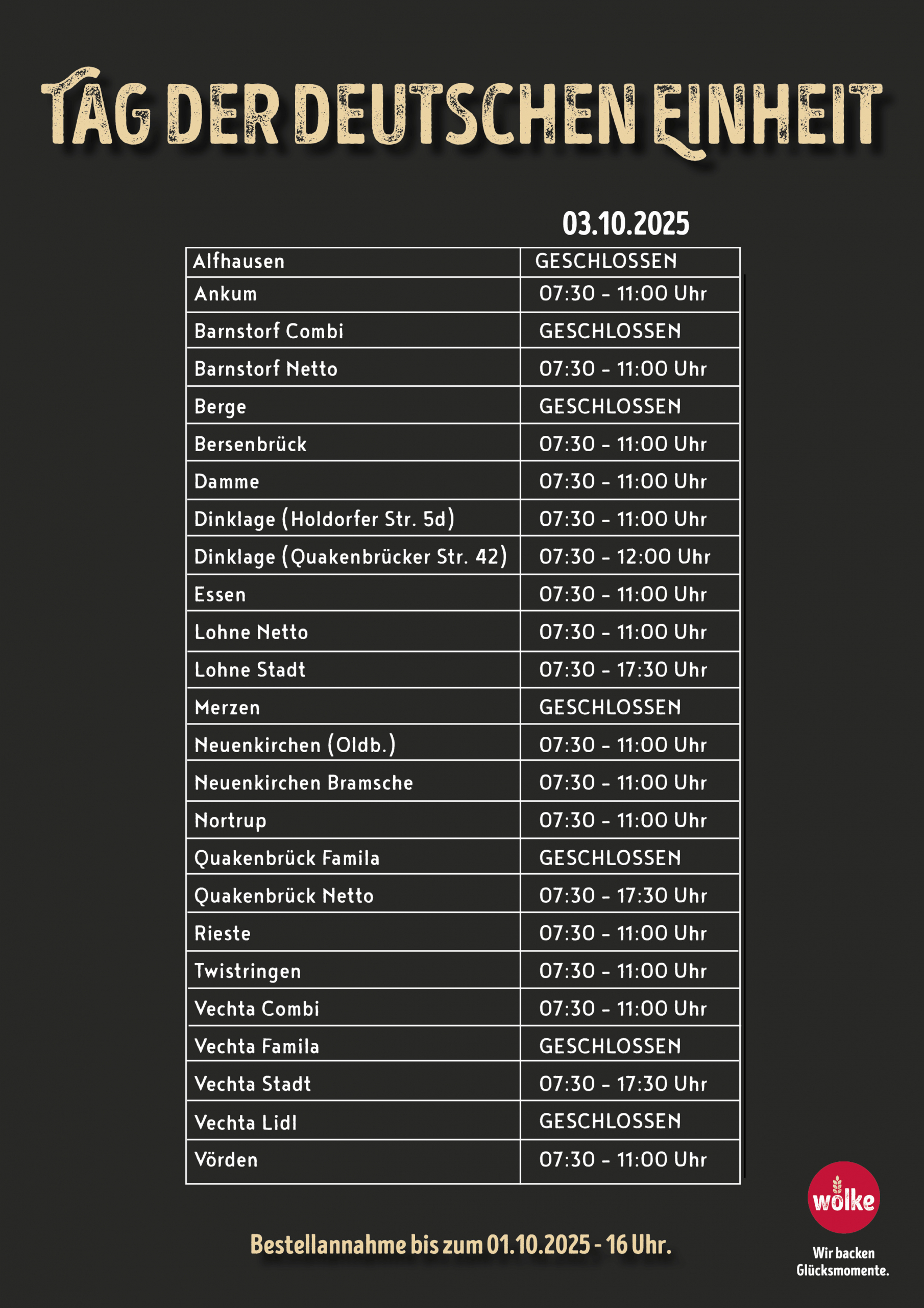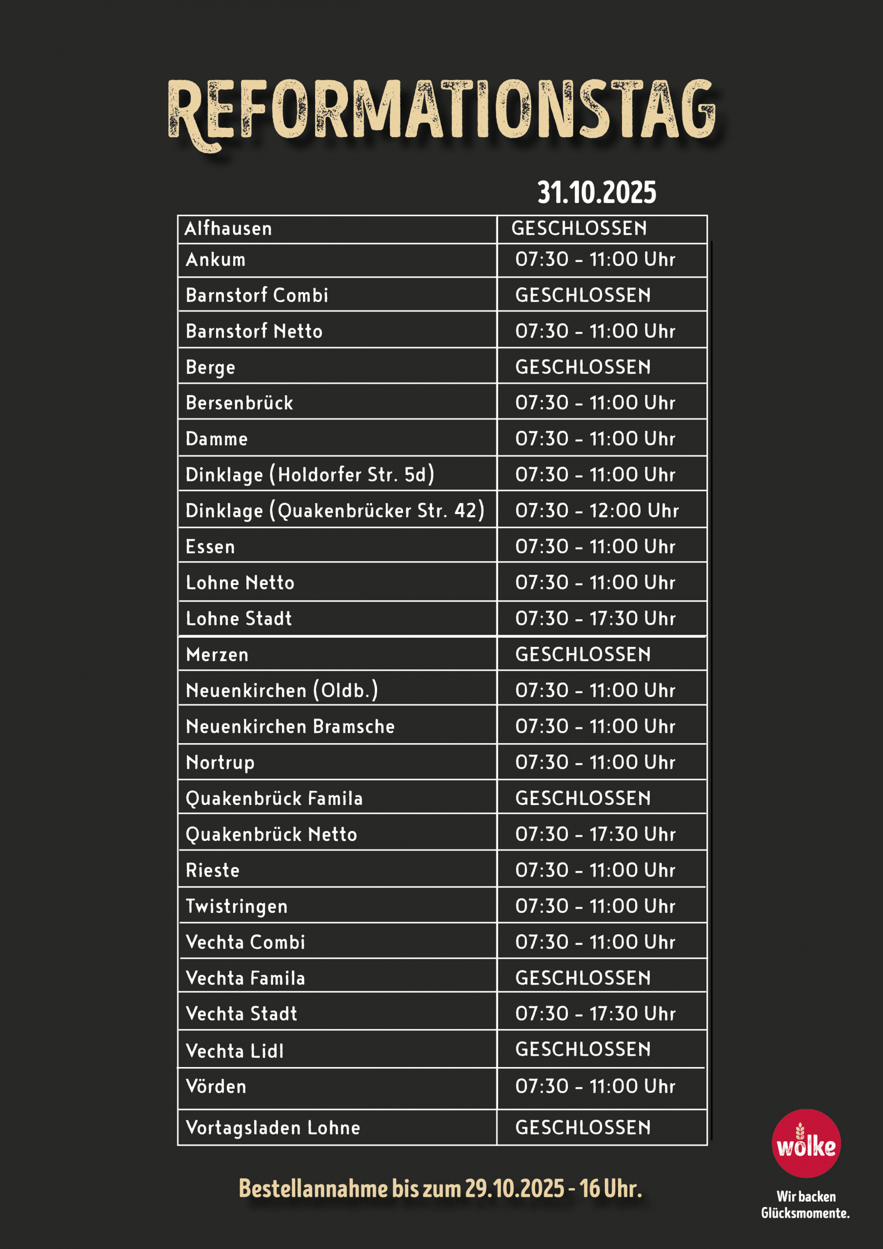 An so einem besonderen Tag braucht auch die Wolkefamilie eine kleine Auszeit. Um euch trotzdem eine Freude zu bereiten haben ein paar Geschäfte dennoch geöffnet.